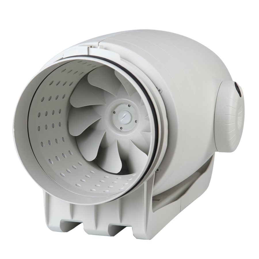 Low profile “Mixed-flow” fans with sound-absorbent insulation, extremely quiet, fan casing manufactured in plastic material, with a specially designed internal skin to direct the sound waves at the right angle for them to be captured by sound-absorbent material, fitted with flexible rubber seals on the inlet and outlet to absorb vibrations, with an external connection box, a body that can be removed without dismantling the adjacent ducting and therefore facilitating any installation or maintenance.